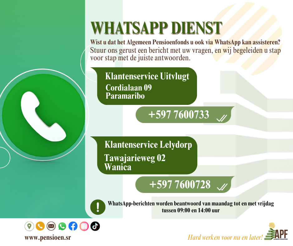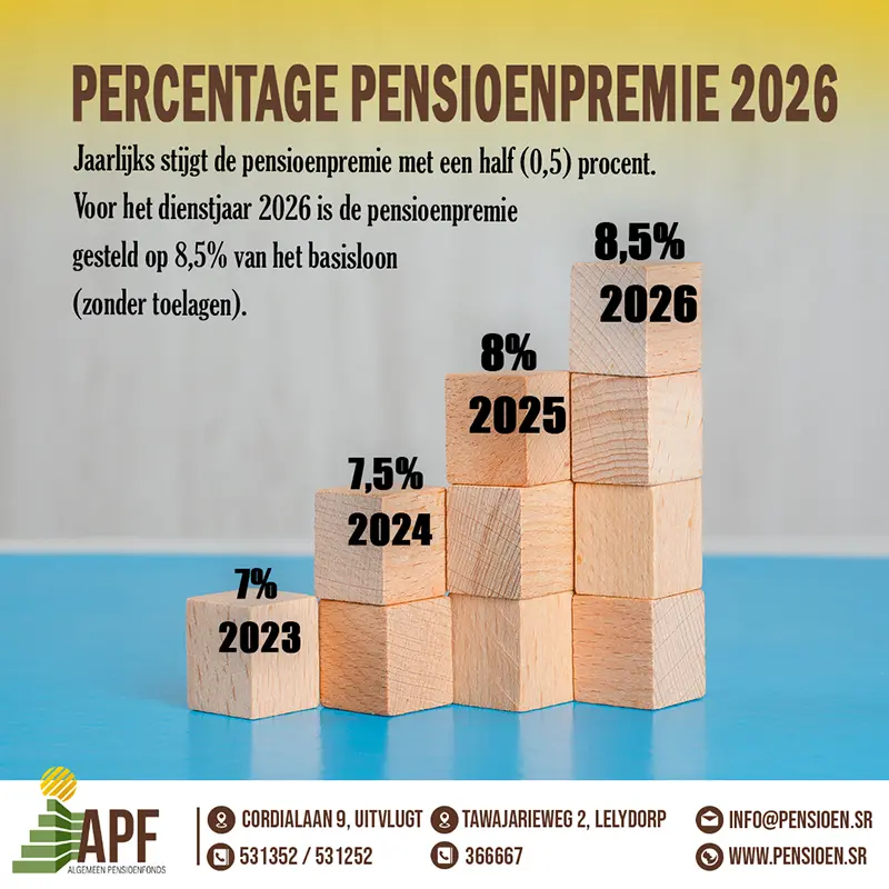 Voor het treffen van een pensioenregeling bent u terecht bij het APF. Registratie geschiedt via onze website: www.pensioen.sr.